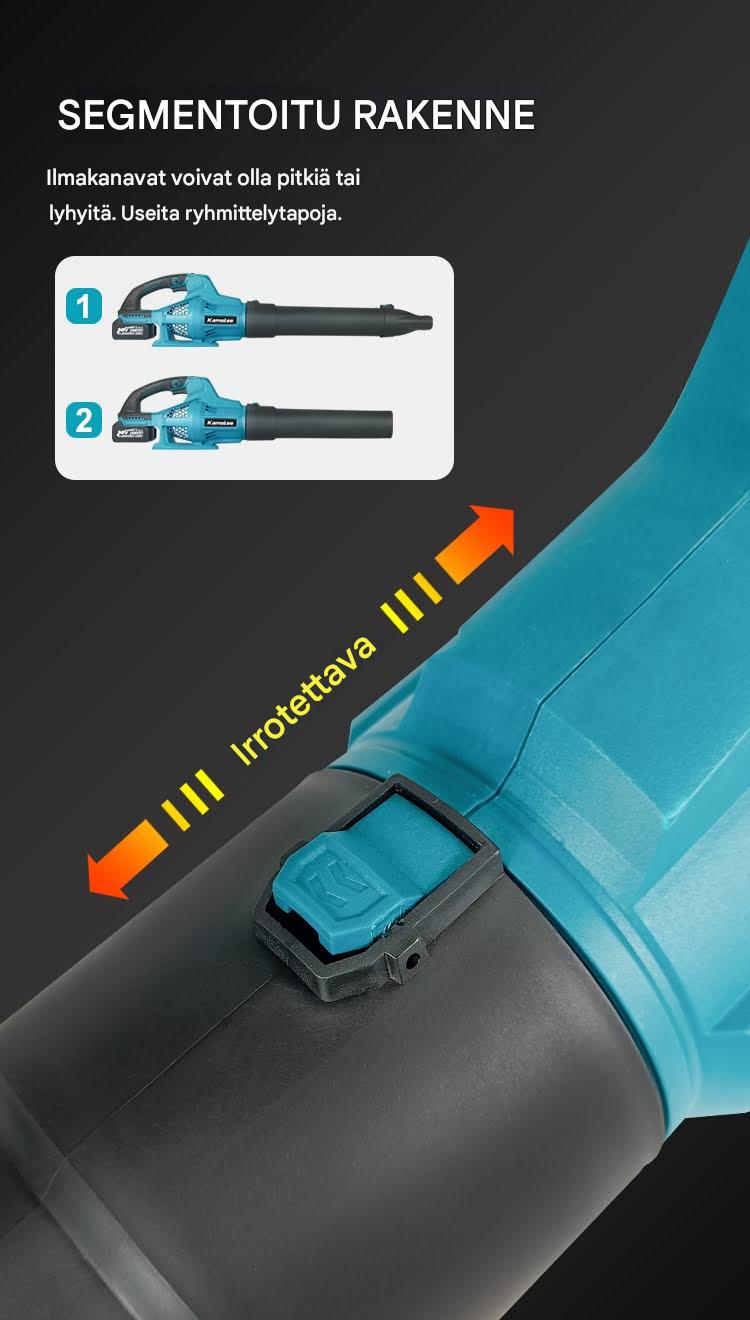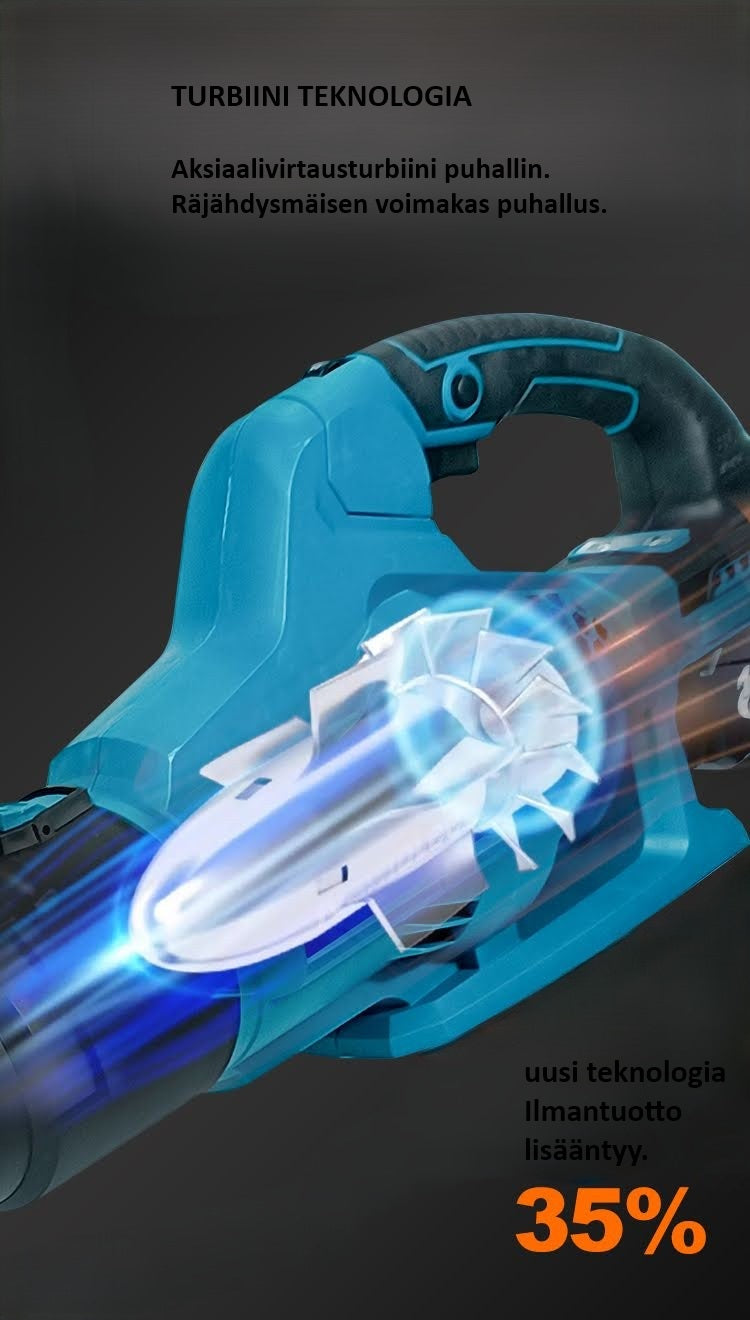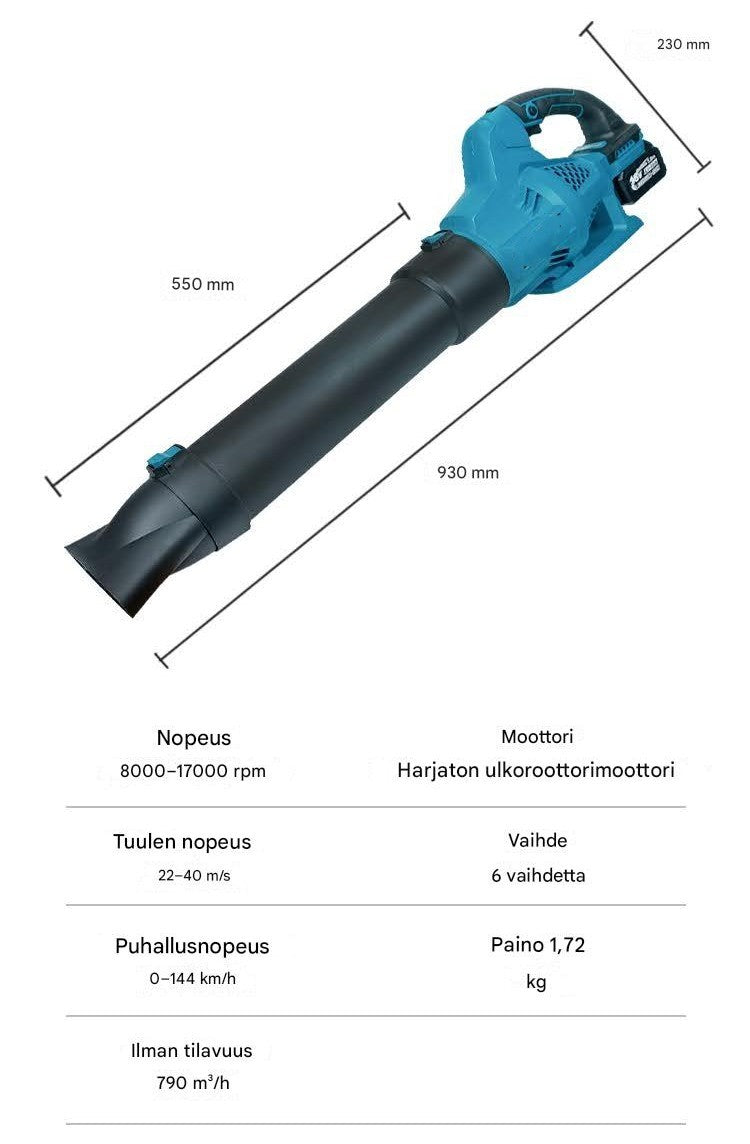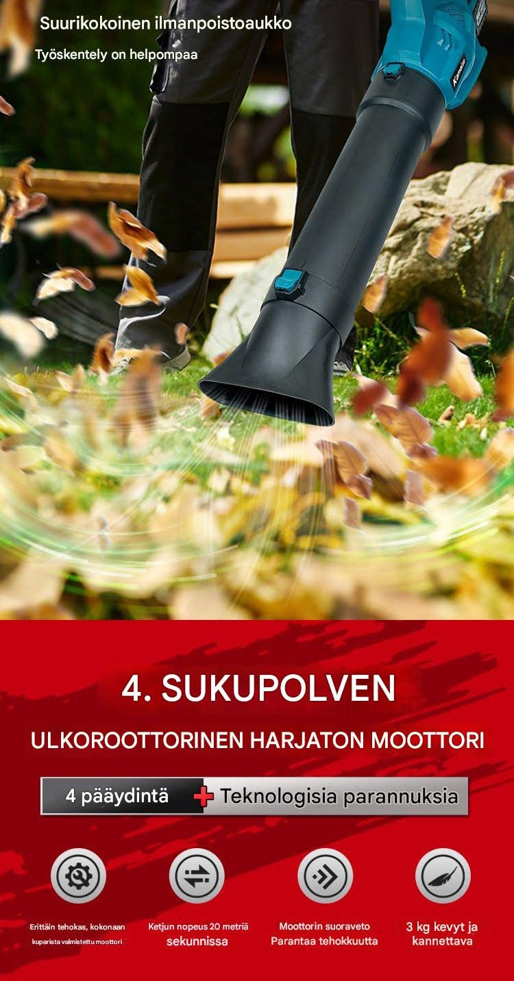 Tämä tehokas harjaton ilmapuhallin, on kevyt ja monikäyttöinen puhallin, joka soveltuu täydellisesti lehtien, pölyn ja roskien poistoon niin kotona, pihalla kuin työpajallakin. Sen harjaton moottori tarjoaa erinomaisen tehon ja pitkän käyttöiän, ja kuusi nopeusasetusta mahdollistavat tarkan hallinnan joka tilanteessa.